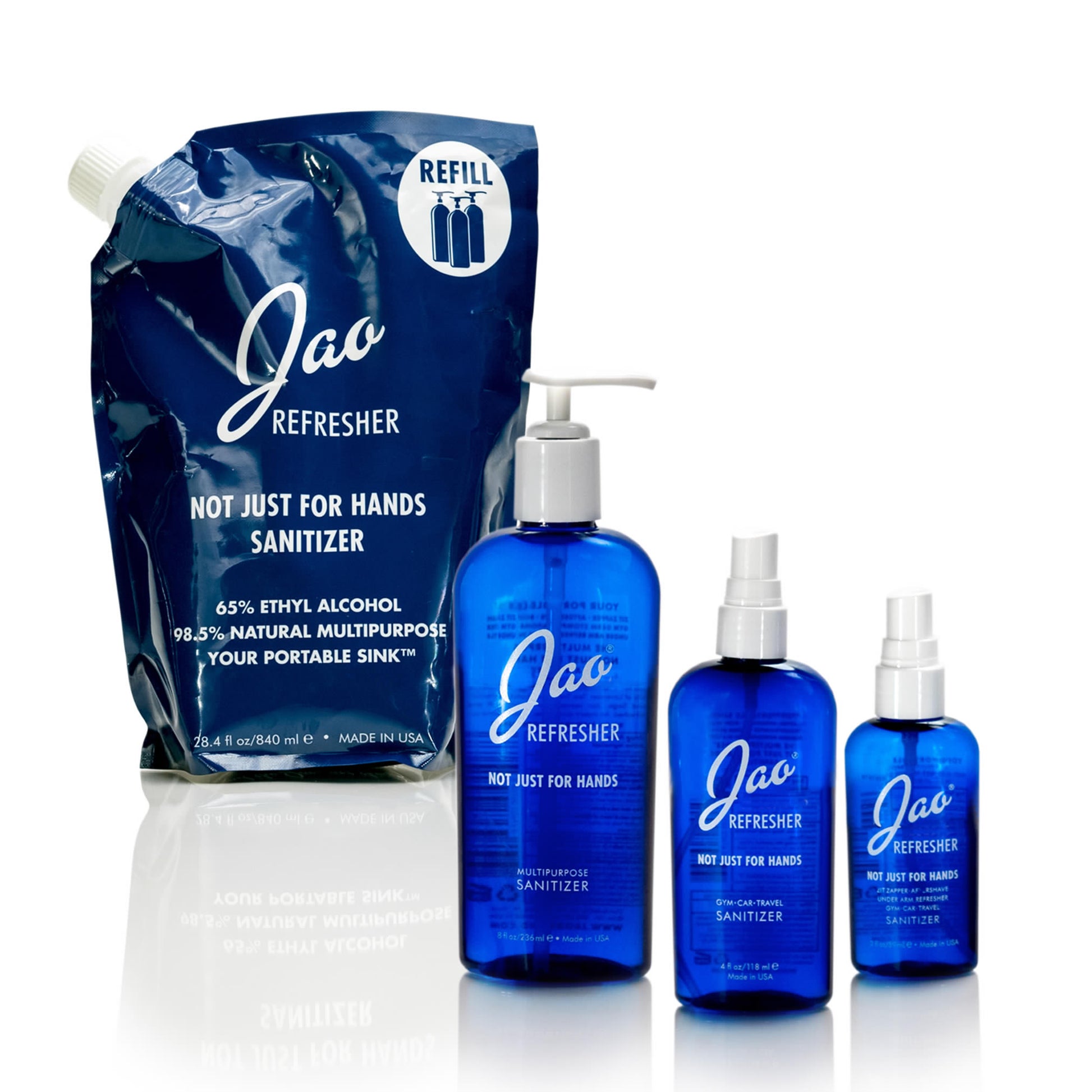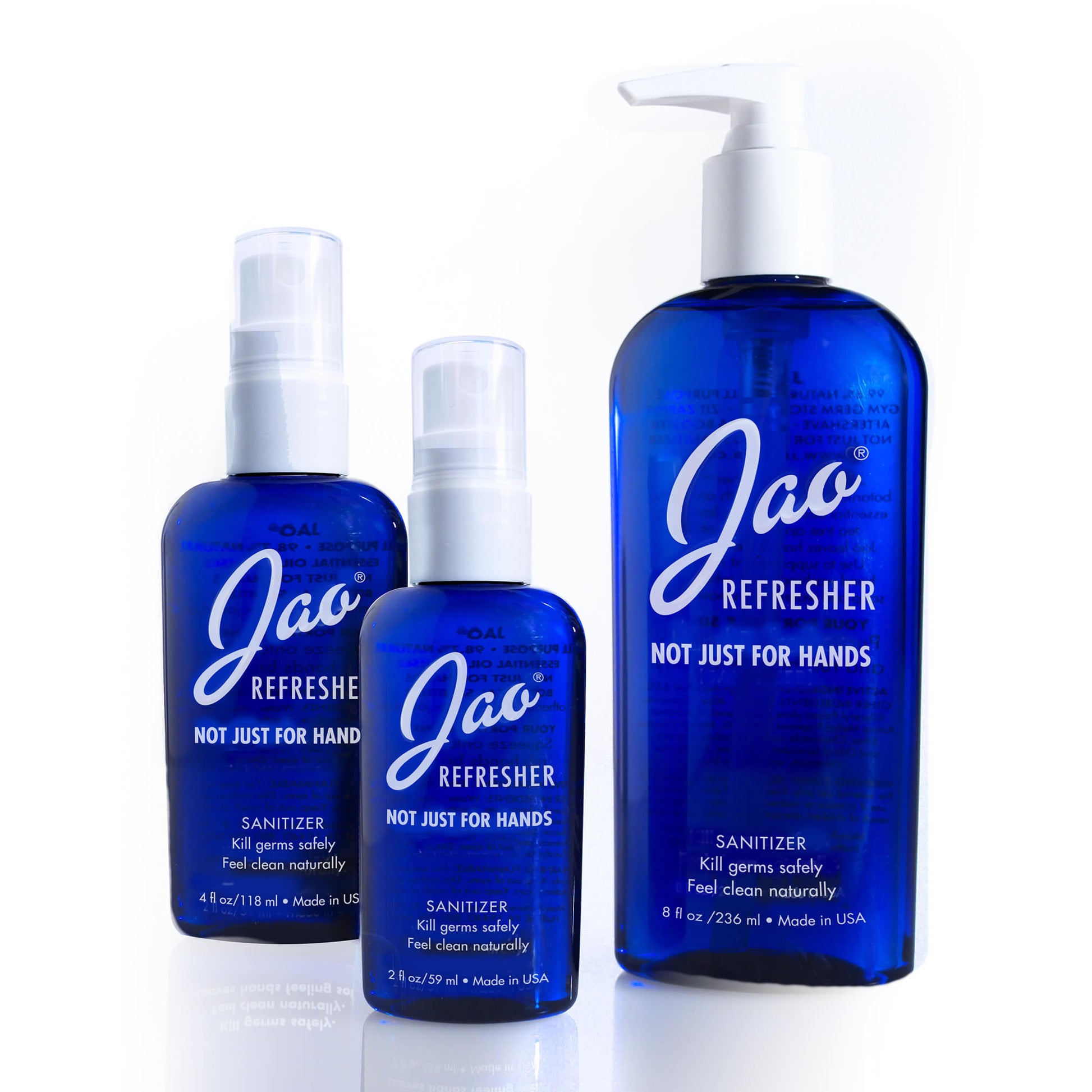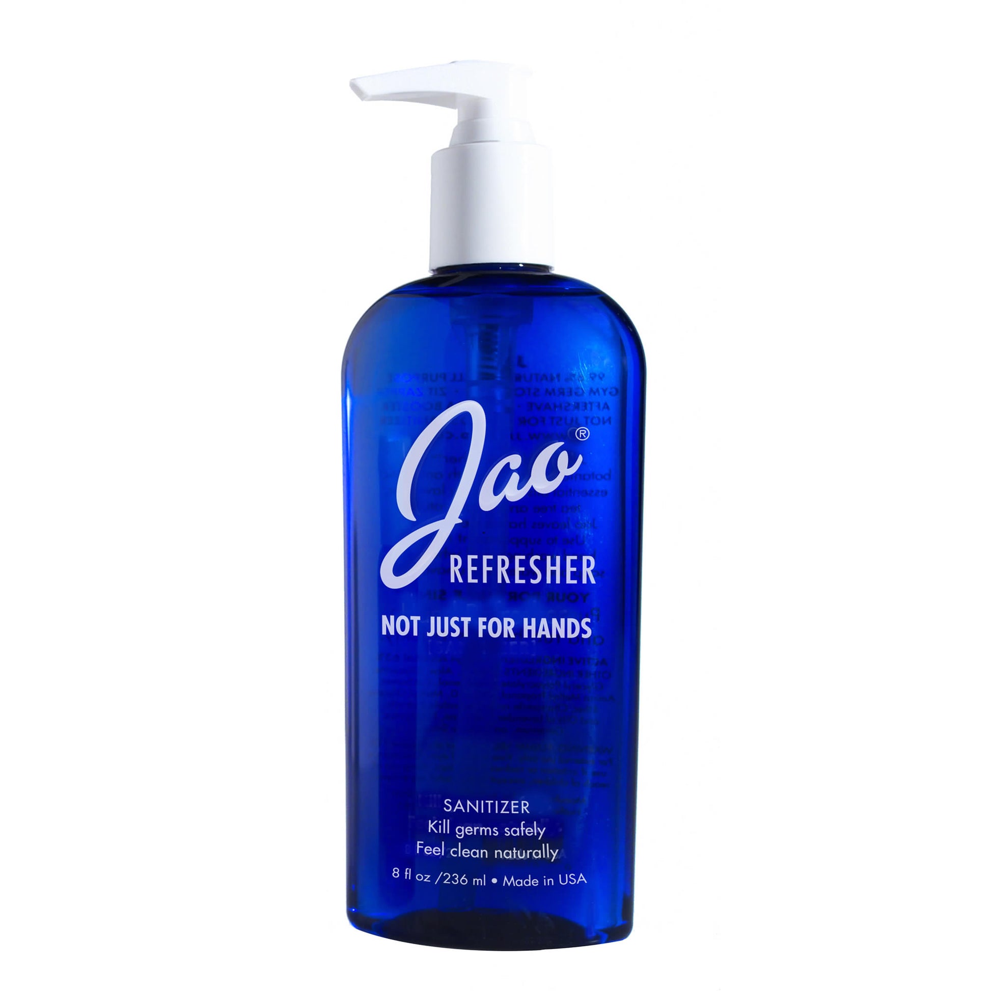 98.5% natural, multipurpose Jao Refresher™ is an instant disinfectant and aromatherapy boost in one. Kills germs and freshens hands with Ethyl Alcohol plant-based (less drying) and our very own blend of antiseptic essential oils: Lavender, Tea Tree, Eucalyptus, Geranium and Sage. We combine Chamomile and Calendula with natural cosmetic moisturizers so it will not dry out your hands. We do not use Triclosan or Bezalkonium Chloride, which are bad for the environment. Leaves skin feeling soft and refreshed - an instant skin cooler, body pick-me-up.