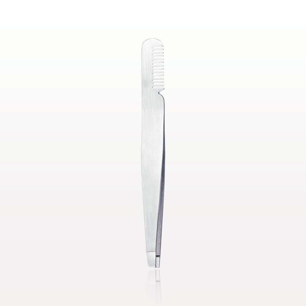 Design the perfectly shaped eyebrow with these dual purpose stainless steel tweezers. First groom hairs in place with the comb side, then tweeze the stray hairs with the slanted tweezer tip.